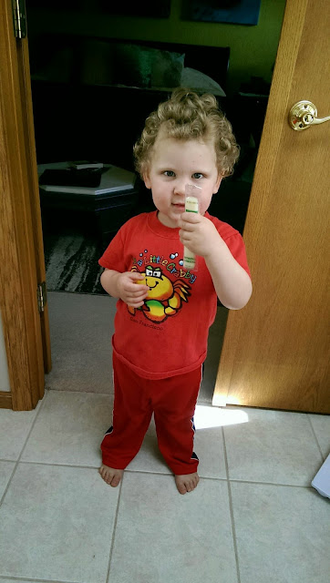 Then I get home, and I have some time to get ready for the day. Eli watches a TV show (usually Thomas, or Daniel Tiger, or Curious George)...and I go upstairs. And now comes the explanation of the cheese sticks. By this time it is about 2 hrs after he's had breakfast and he decides it is time for a morning snack. He can reach the drawer in the fridge where the cheese sticks are, and he takes one out and brings it up to the bathroom so I can help him peel off the wrapper. He's gotten 2, sometimes 3 and eats them all. I snapped this pic and wanted to remember his raiding-of-the-cheese-drawer in the mornings.